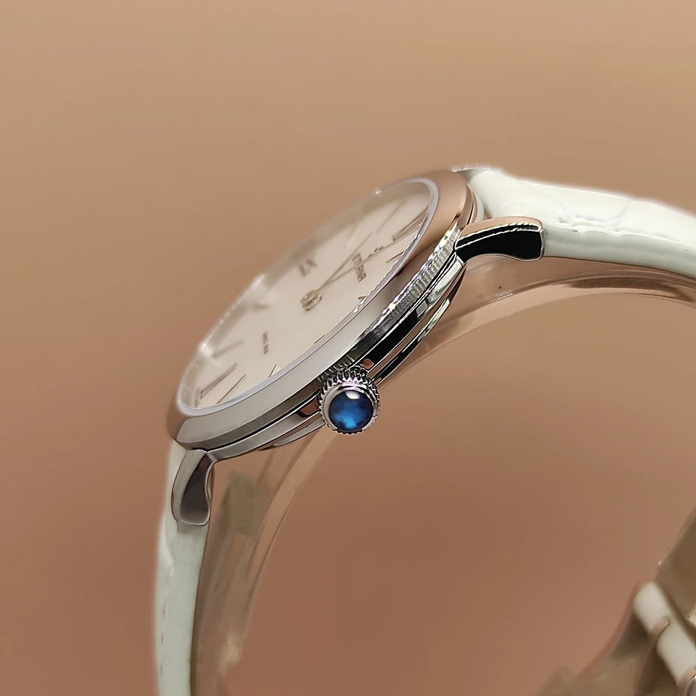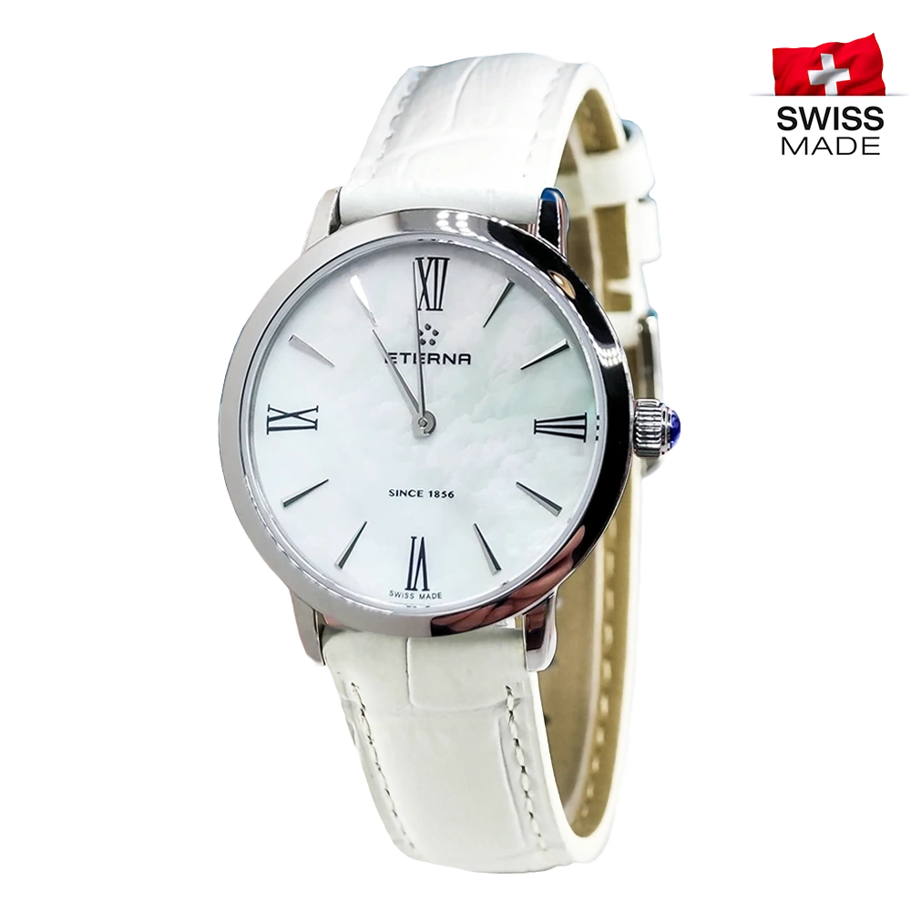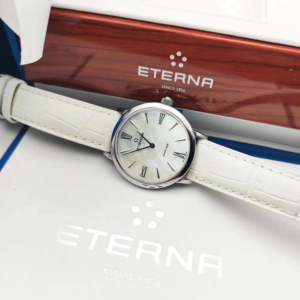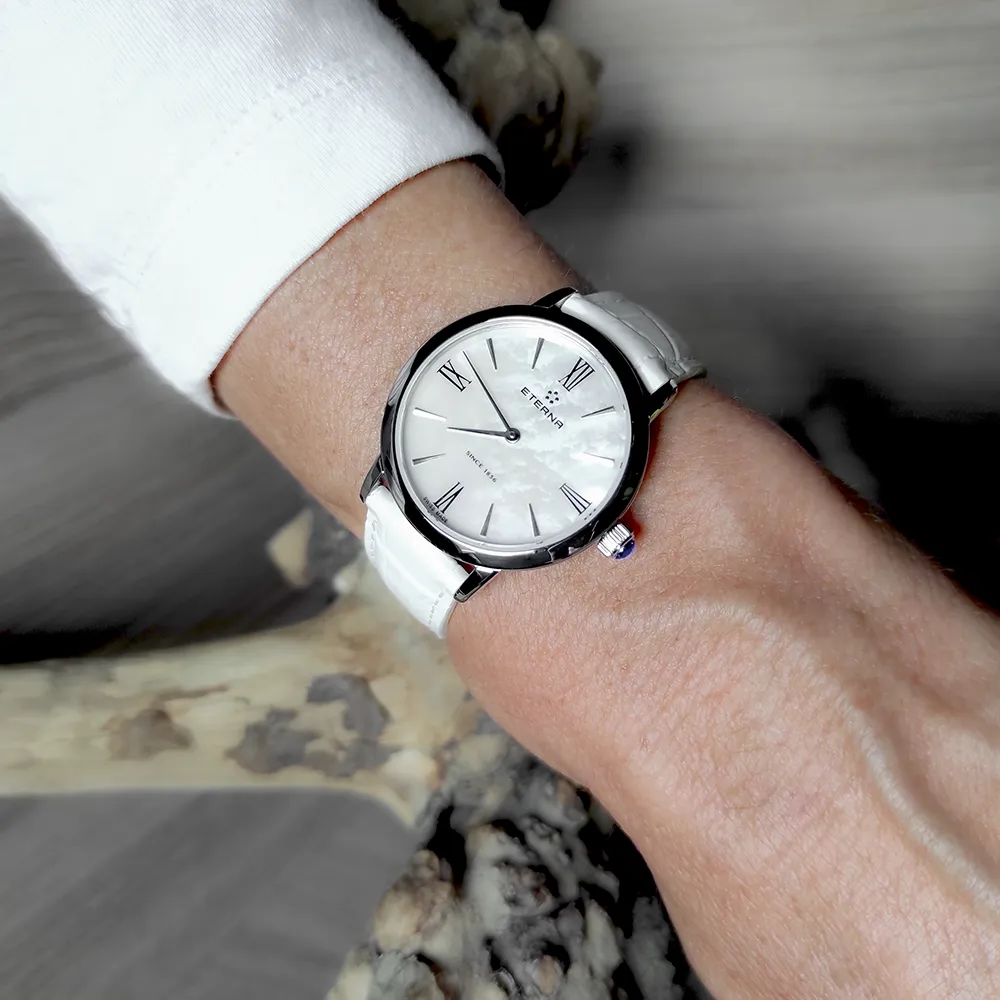 The Eterna Eternity is a testament to timeless beauty and precision. With its stainless steel case, measuring 32mm in diameter, and a pressed-in case back, it’s a combination of durability and elegance. The exquisite White Mother of Pearl Dial, protected by an anti-reflective sapphire crystal, exudes a sense of sophistication. Powered by a reliable Quartz movement with the ETA 956.412 calibre, this watch ensures accurate timekeeping.