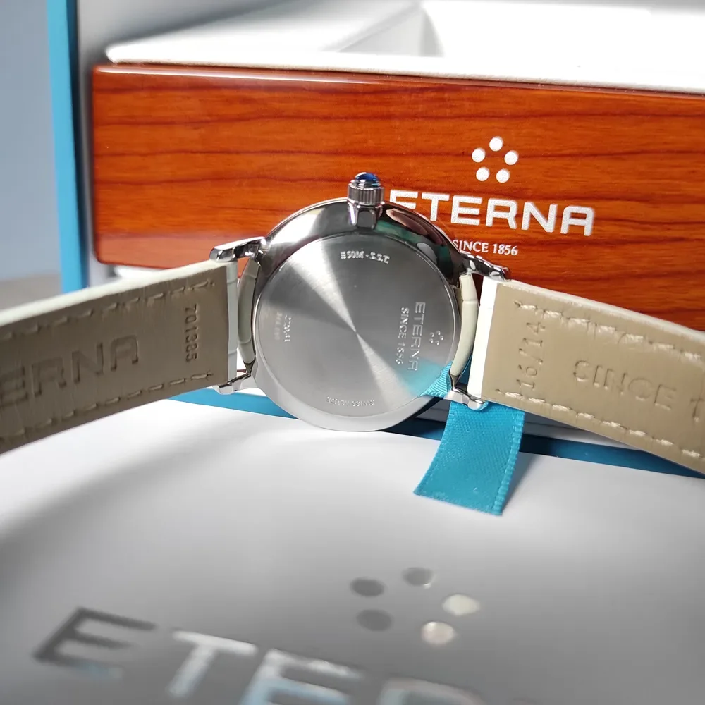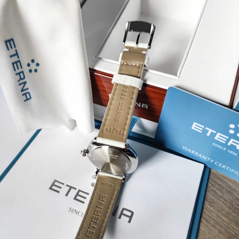 The leather strap in white, with a secure buckle clasp, offers both comfort and a touch of luxury. With a water resistance of 50m, it’s suitable for everyday wear, although it’s not recommended for activities involving heavy water exposure. The Eterna Eternity is more than just a watch; it’s a reflection of your impeccable taste and appreciation for Swiss craftsmanship and timeless beauty. Embrace this art from Switzerland and make it an integral part of your outfit.