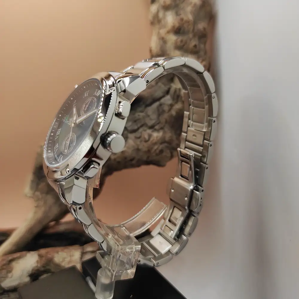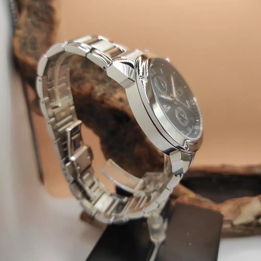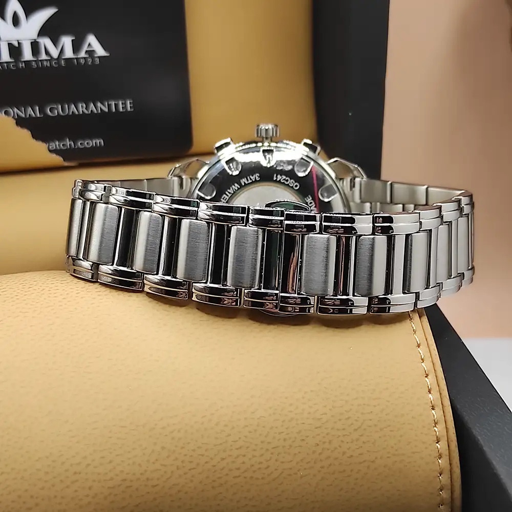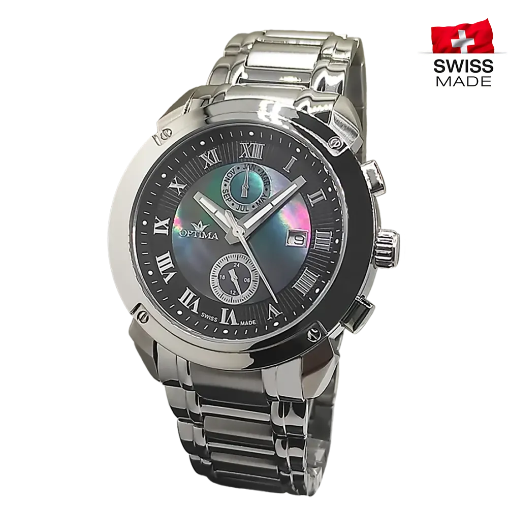 Swiss Dual Time Elevate your style with this luxury Optima wristwatch featuring Swiss movement and a sleek silver case. The round dial boasts luminous hands, silver PVD indices, and Roman numerals for a classic look, while the dual time add functionality. The dial out circle is black and the Inner in sophisticated manner with black mother of pearl. Bracelet with Button Butterfly clasp.