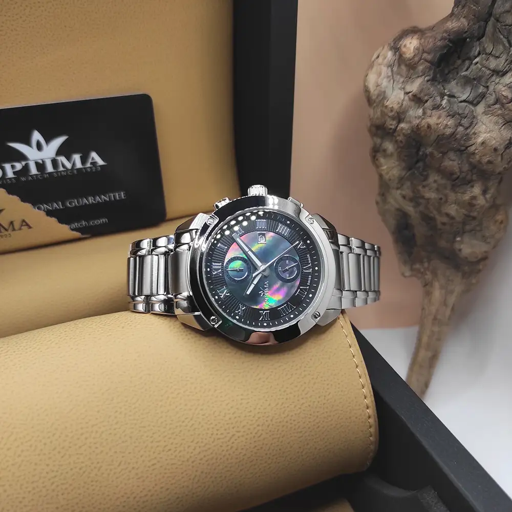 Optima birth located in 1923 in Switzerland until Now . From metals and mother-of-pearl to precious stones, Optima combines different materials in layers to create a subtle embossed effect on the watch face. The Optima craftmanship relies in the history of swiss watchmaking from 1923 to present.